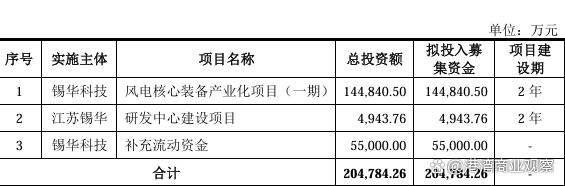此次IPO,锡华科技计划拟募资14.98亿元,其中募投计划的96%即14.48亿元用于风电核心装备产业化项目(一期);4943.76万元用于研发中心建设项目。然而,这一募资金额较初次递表时募资金额已然被砍掉了5.5亿元的补流项目。
