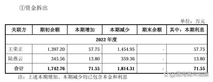 2022年,于实际控制人个人资金需求,公司曾存在向实际控制人或其指定的对手方拆出资金的情形,具体用于投资理财、向近亲属提供借款用于购置房产等用途。2022年,拆借给实控人王荣正、陆燕云的资金期初合计1742.76万元,本期利息71.55万元。