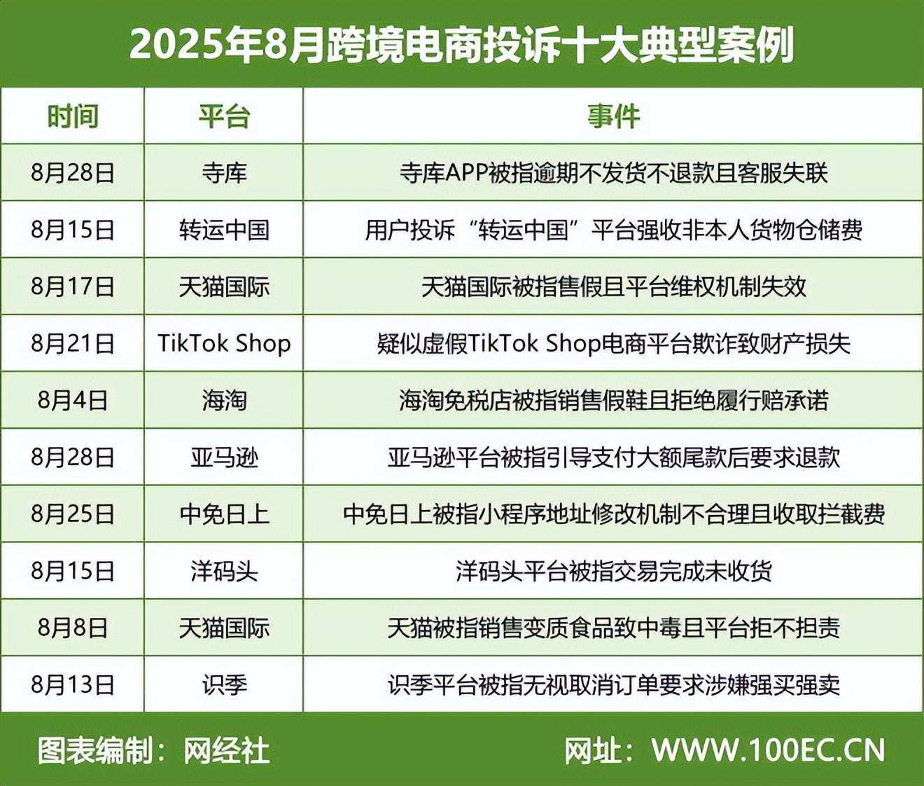 此外,入选《2025年8月跨境电商十大典型投诉案例》的有:寺库、转运中国、天猫国际、TikTok Shop、海淘、亚马逊、中免日上、洋码头、识季。