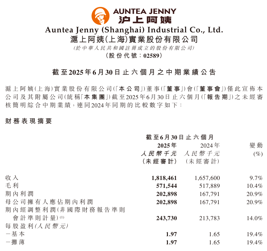 近日,沪上阿姨披露了上半年业绩情况。财报显示,截至2025年6月30日止六个月,公司收入为18.18亿元,同比增长9.7%。毛利为5.72亿元,同比增长10.4%。期内利润和母公司拥有人应占期内利润均为2.03亿元,同比增长20.9%。期内经调整利润为2.44亿元,同比增长14.0%。