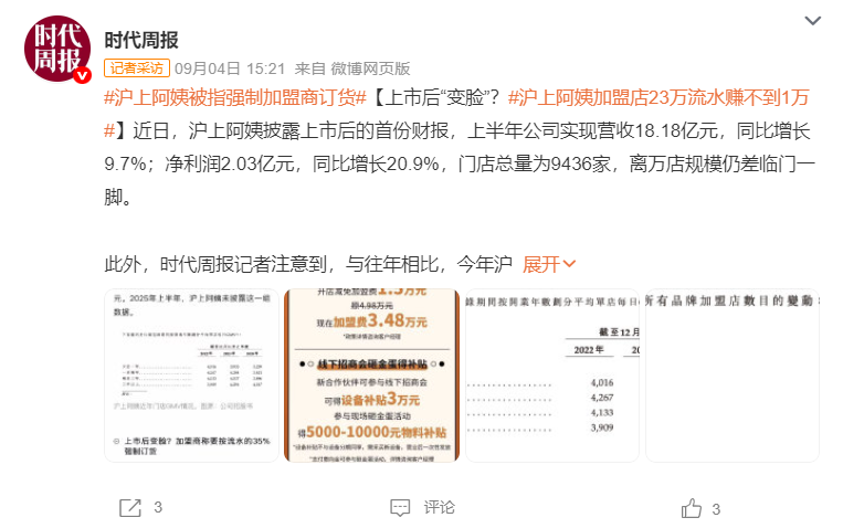 据“时代周报”报道,这背后,沪上阿姨与老加盟商的矛盾也愈发凸显。多位沪上阿姨加盟商称,上市后,沪上阿姨对他们强制压货,促销力度也越来越大,导致实收仅占流水的60%或以下。“6月份门店月流水达23.5万元,实收12万,但利润不到1万。”一位加盟商表示。