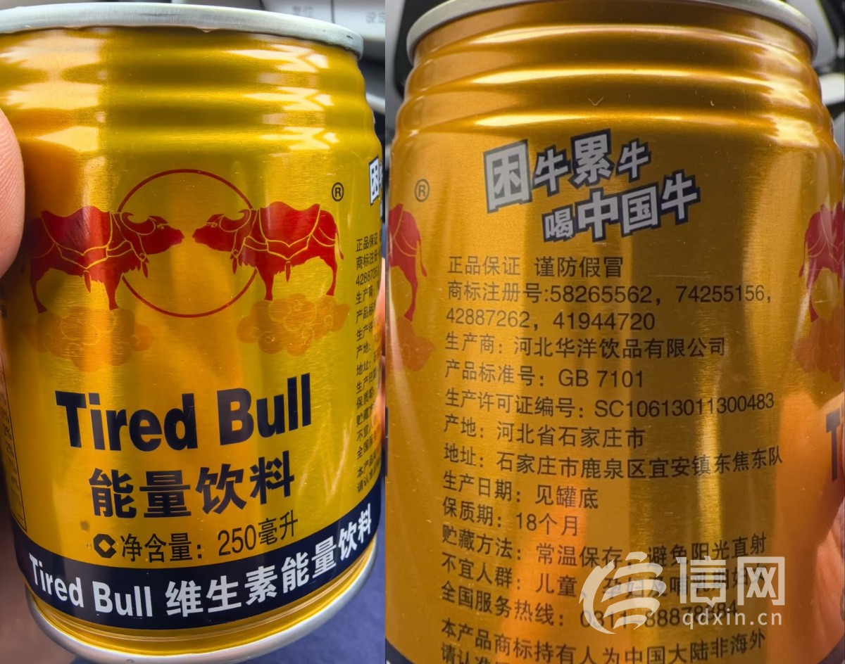 “累牛”能量饮料。(来源:受访者)信网9月5日讯 近日,市民赵先生向信网(0532-80889431)反映,自己本想购买知名能量饮料“红牛”,饮用时发现味道不对,仔细查看后才认出手中的饮品是一款名为“累牛”(英文标识“Tired Bull”)的能量饮料。对此,信网联系了“累牛”饮料出品方河北华洋饮品有限公司法定代表人安先生,安先生表示这款产品是自主创立品牌,公司持有全部的相关合法手续,不管是线上还是线下售卖都不会有法律风险。