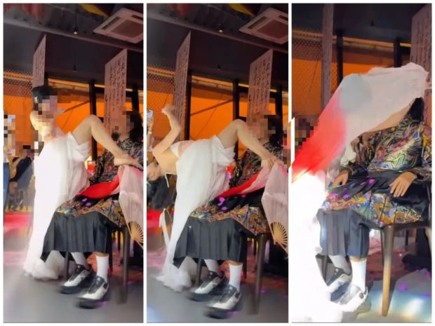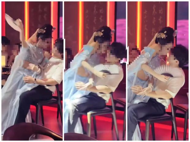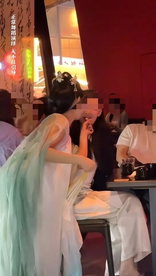 另一场表演中,同样身穿浅蓝色裙子的美女,手持一把扇子,一个转身跳到顾客怀里,一边为对方扇扇子,一边欲与其“接吻”一样贴得很近。注意看,顾客的一只手还恰好在女子小腹处,但该女子仅仅只是将自己的手搭在对方手上,并未有排斥动作。