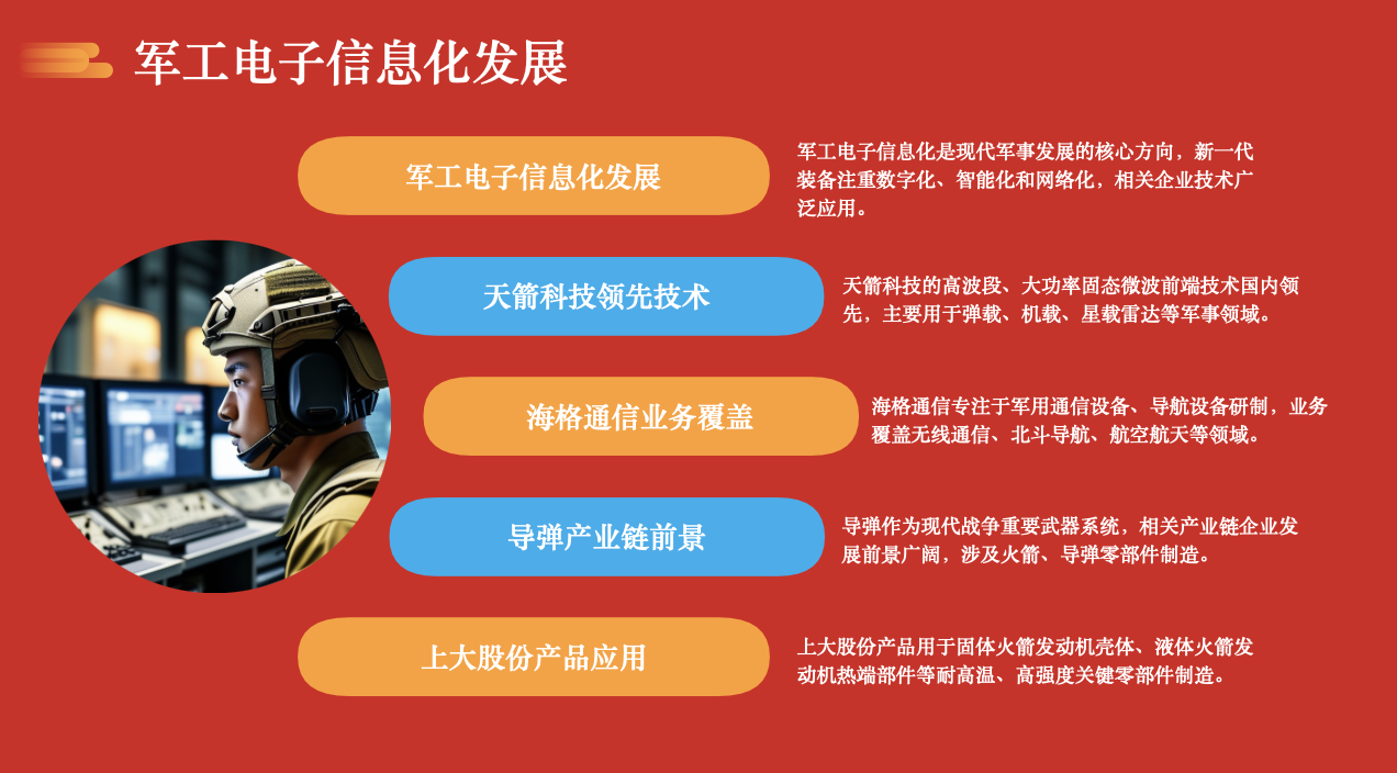 例如,天箭科技的高波段、大功率固态微波前端相关技术国内领先,主要用于弹载、机载、星载雷达等军事领域。海格通信则专注于军用通信设备、导航设备研制,业务覆盖无线通信、北斗导航、航空航天等领域。