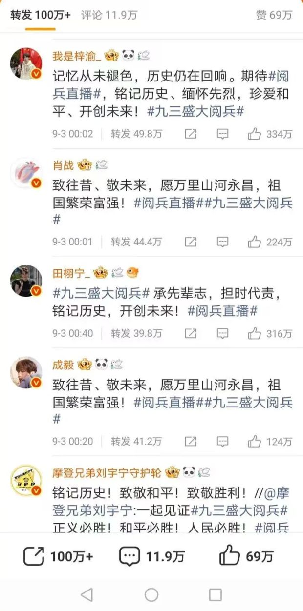 九三阅兵转发微博下,耽改6.0《逆爱》的双男主梓渝、田栩宁均达到300多万赞,对老顶流肖战形成夹击之势。粉丝长情能打的成毅和剧集接连热播的刘宇宁,更只能敬陪末座。