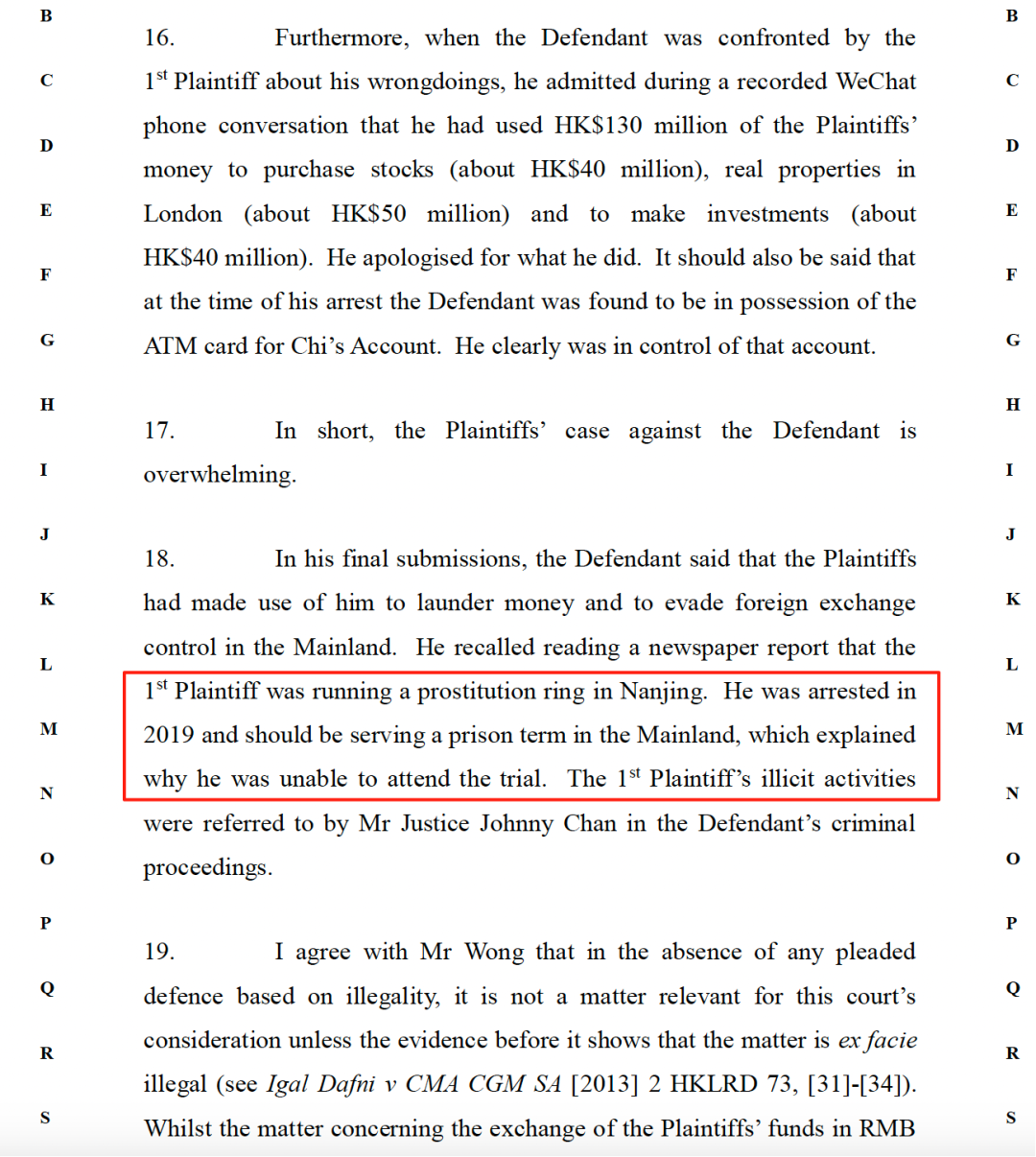 值得注意的是,判决书显示,本案受害人、原告于全利与妻子楼小洁并非普通人。香港法院在判决书中明确指出,于全利用于转账的1.3亿元“极可能来自有组织的非法卖淫活动”,而孙健荣作为专业金融顾问,对资金非法性“应当知情”。