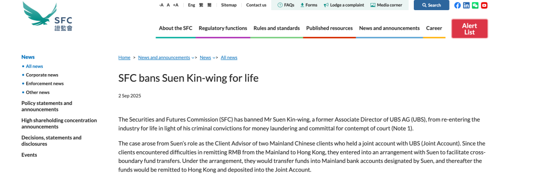 近日,香港证监会披露,瑞银集团(UBS AG)前副总监孙健荣因以“协助跨境汇款”为名私吞内地客户逾1.3亿港元资金并大肆挥霍,已被裁定洗钱罪及藐视法庭罪成立,合计判处十年六个月监禁;香港证监会同时宣布,终身禁止孙健荣重投金融业界。