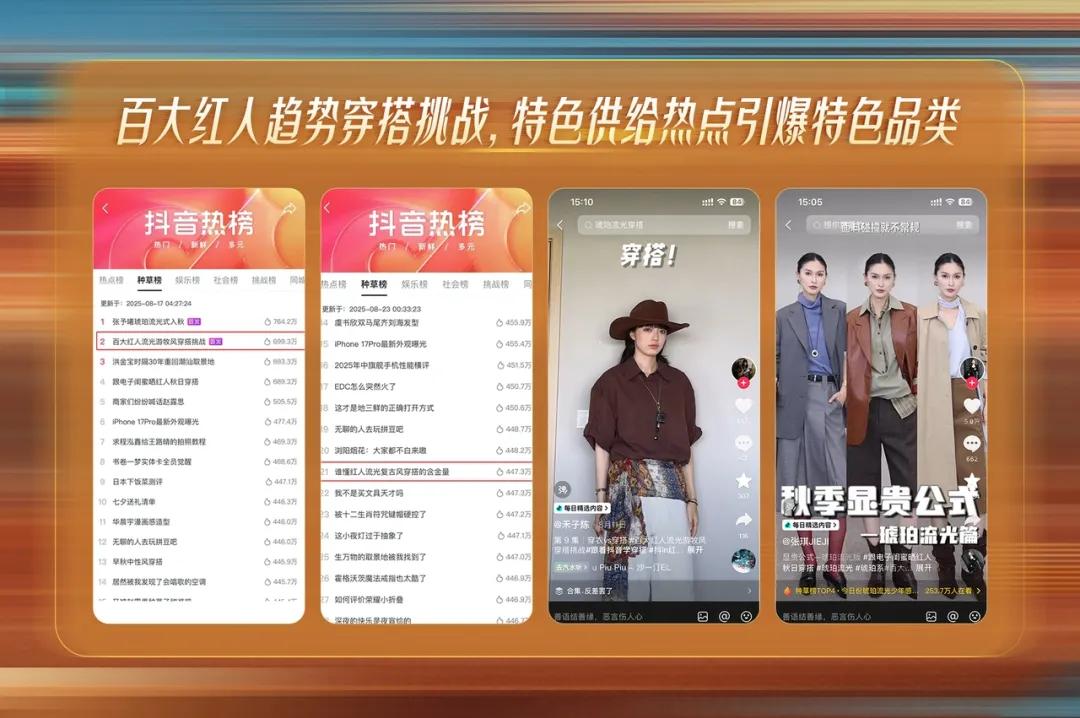 如果说明星胜在认知广度,具备辐射不同圈层的国民影响力,那么深耕垂直赛道的红人则赢在深度,更懂细分领域用户、热点传播规律。**在平台、明星携手打开局面后,抖音商城一众红人迅速跟进扩散:紧扣「琥珀流光」主趋势多触点、高密度、广发散共创热点,搭配创意短视频内容,进一步打透用户心智——**首发红人、跟进红人、UGC用户共创的层层叠加,“百大红人流光游牧风穿搭挑战赛”等活动的轮番上演,百大红人发起的粉丝买家秀挑战赛吸引了超10万UGC投稿内容,让用户在互动中牢牢记住「琥珀流光」这一主趋势。