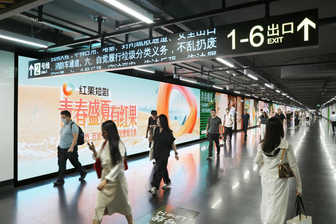红果携手《费加罗》,与曾辉、韩雨彤、王小亿等8位头部短剧演员,拍摄了一组多巴胺风格的夏日主题大片,更附上他们的短剧成绩单,将之打造为百米巨幕、国内最长地铁LED大屏,吸引粉丝合照打卡、上红果搜索作品,为用户达人提供了更多二创传播物料,也打通了线上下流量的闭环。