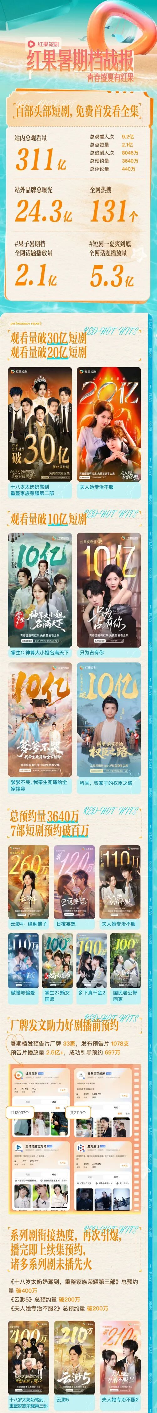 一组数据能够证明红果短剧暑期档在全网的影响力:站内总观看量311亿,总评论量440万,总点赞量2.1亿。站外品牌总曝光24.3亿,全网热搜131个,#果子暑期档 获全网话题播放2.1亿,#短剧一夏爽到底 斩获全网话题播放量5.3亿。
