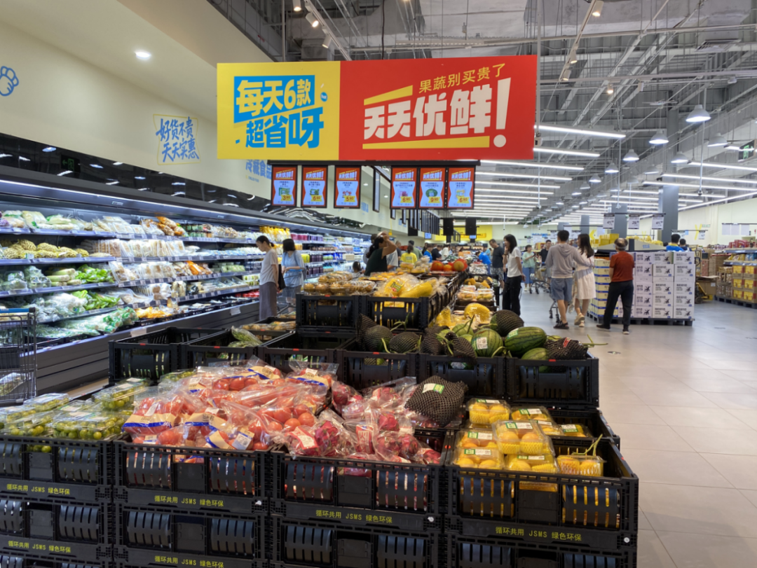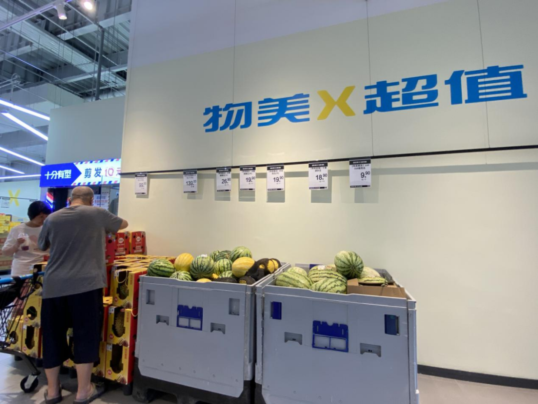 一进门,即是物美超值的果蔬生鲜区,不少顾客在此驻足挑选。在与DoNews的简单交流中,多位挑选水果的顾客都表达了“水果品质不错、价格实惠、包装干净方便拿取”的观点。以西瓜为例,在这里,西瓜按品种、个头大小被分门别类地放好,最高花上26.9元就可以买到一个个头被划分为“大”的冰糖麒麟瓜,中等个头则只需要19.9元一个,最低价位9.9元一个的冰糖西瓜个头看起来同样不小。