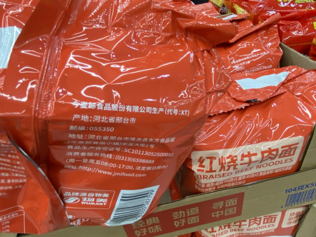 DoNews注意到,物美的自有商品不乏“大厂”代工。比如,一款标示“物美精选”的红烧牛肉面商品,生产商为方便面行业代表性企业今麦郎食品股份有限公司。