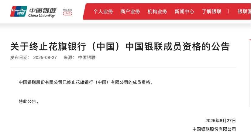 中国银联近日发布公告称,已终止花旗银行(中国)有限公司的成员资格,但未披露具体原因。这一调整使在华外资银行银联成员数量从9家缩减至8家,目前仍持有该资格的外资银行包括汇丰、渣打、东亚、星展、瑞穗、德意志、三菱日联及恒生银行等。