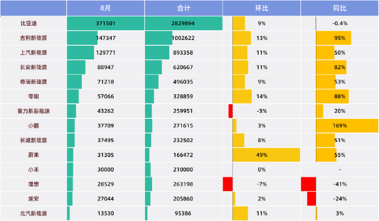 8月有两个现象非常突出,比亚迪对于厂商的优势在缩小,比亚迪自身的同比与环比增速在下降,而第二梯队的多数企业普遍增长势头非常猛烈,比亚迪这只“头狼”,正在被后面的群狼迎头赶上。