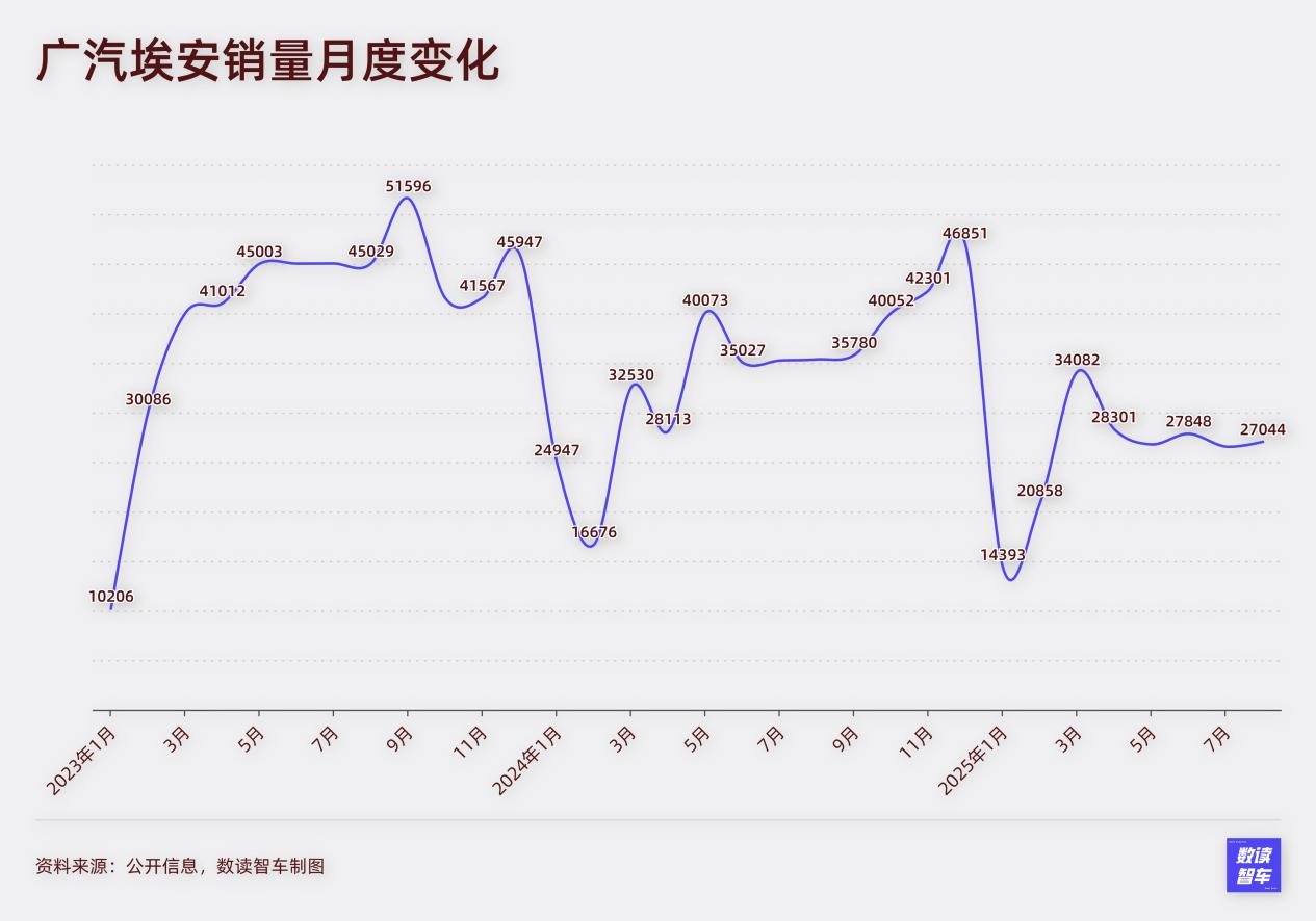 埃安8月销量为27044台,环比增加487台,同比大幅减少8311台。今年前8个月,埃安只在3月的销量短暂突破过3万台,随后一直处于平稳,销量在2.7万台左右。