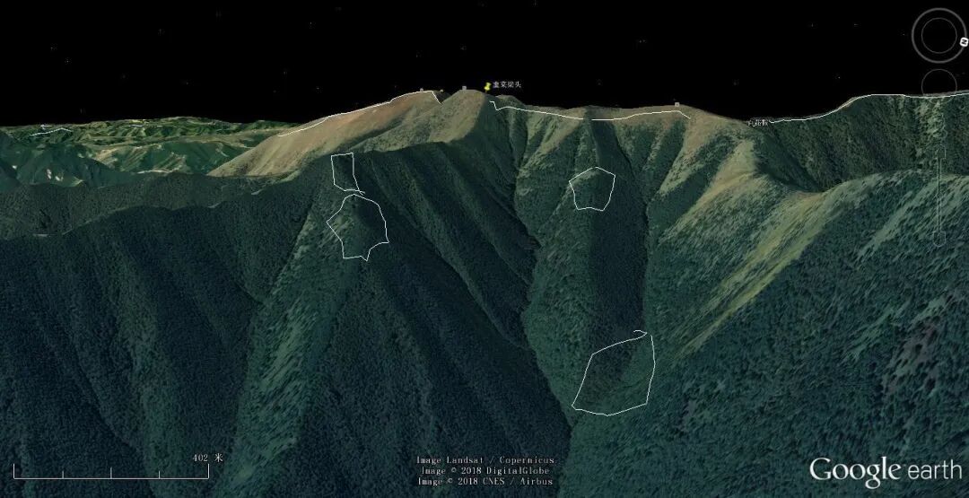 猫科动物喜欢走的地方。白线是山脊,白圈是它们休息会选择的,较平缓的林间空地 制图:老蒋