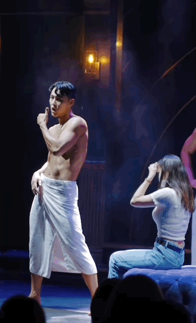 宽肩窄腰的猛男们先是在舞台上表演,演出中途,他们会跑下台对观众“椅咚”,坐在她的腿上跳舞。同样,他们也会抽选幸运观众上台互动,演员会拉着她的手,轻轻亲吻她的额头,邀请她试试自己腹肌的手感。