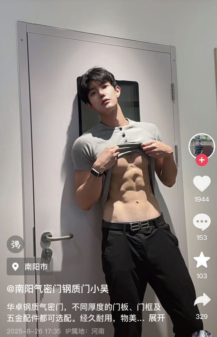 河南的小吴家里有个钢质门工厂。自从接手家里的生意,他拍科普视频,拍业务合作,拍产品介绍,最终在一声声的“隔壁卖蓝莓的都脱了”的诱导下,身材越来越壮,衣服也越穿越紧,最终,八块腹肌还是出场了。
