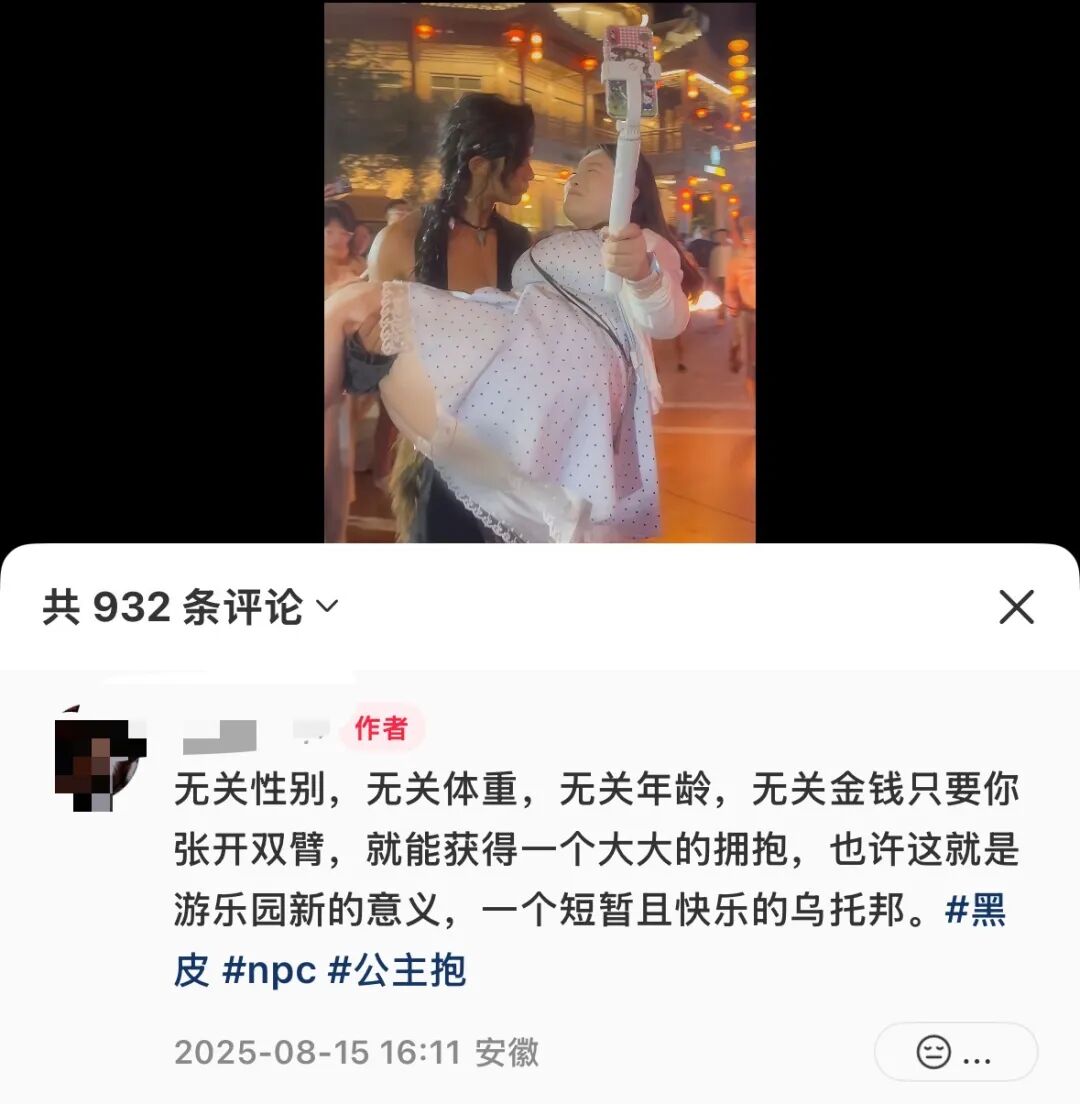 一位在景区里排了一整天,追随着所有npc的女孩疲惫又高兴。她清楚地知道,这些亲密与珍视都是表演出来的,这所游乐园就像灰姑娘参加的那场舞会。但哪怕舞会只有3分钟,她们依旧得到了自己需要的。