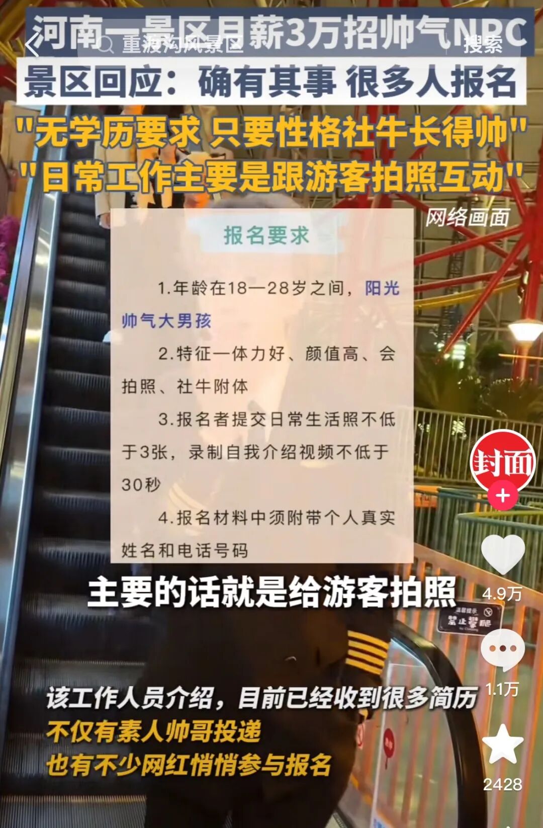 5月份,河南洛阳重渡沟景区发布npc招聘需求,月薪三万,不限制学历,只要求年龄在18岁到28岁,“性格社牛长得帅”,日常工作就是跟游客拍照互动。