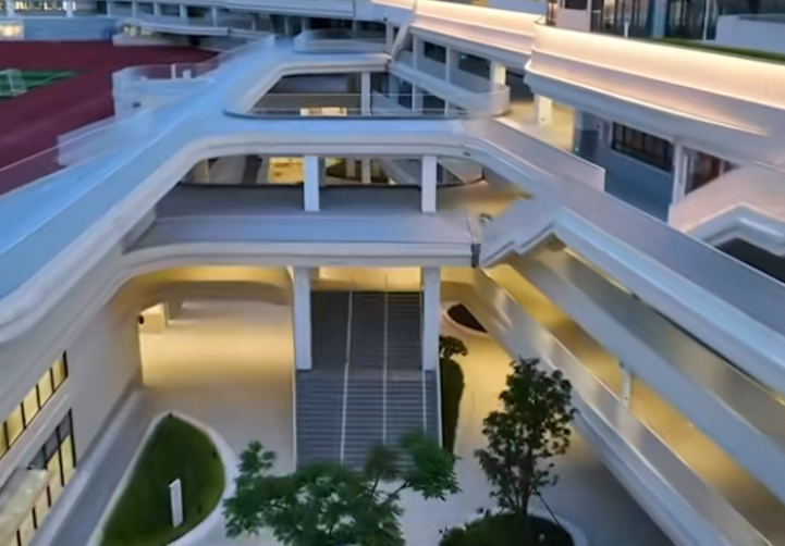 宁波市惠贞高级中学,教学楼建在3000平的空中森林里,孩子们一下课就可以自由地在林间奔跑,可以随意地“浪费时间”。