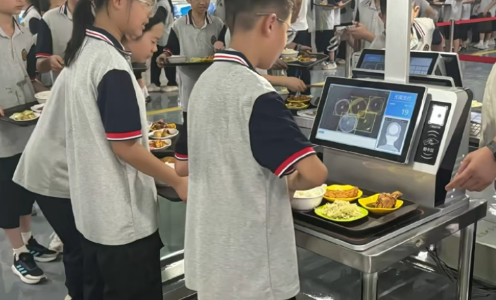孩子们在食堂吃饭,凭借餐盘颜色自主刷卡,结账通过人脸识别自动扣款。