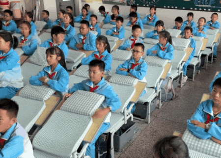 但现在,许多小学引进了可以撑开的桌椅,孩子们可以直接躺在桌椅上午休,免去浑身的酸痛。