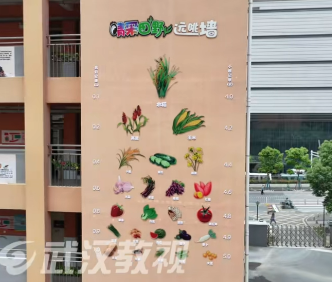 武汉一所学校则修建田园主题的远眺墙,墙上贴着各种水果和蔬菜,孩子们在放松眼睛的同时,还能认识许多农作物。