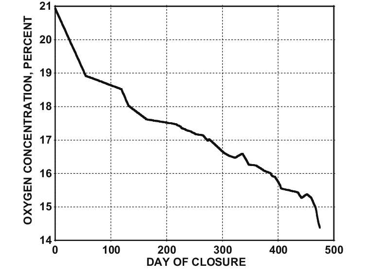“生物圈2号”里氧气浓度的下降曲线。(图片来源:William Dempster)