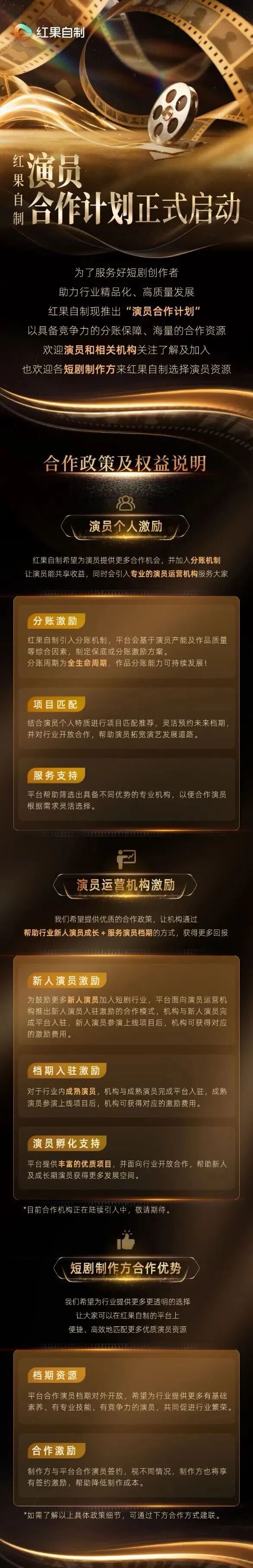 红果推出《演员合作计划》,确认演员分账制,在行业内引发强烈关注,其核心内容主要是鼓励演员及演员机构纷纷参与平台,成为专业资源匹配的其中环节,进而享受各种激励政策。同时也对应为演员及演员合作机构匹配相应资源,成为事实上的“资源调度者”——