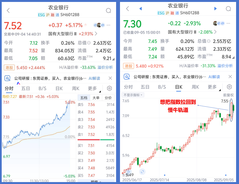 为了保证慢牛的继续,于是我们看到:昨天农业银行爆拉5个点,而上一次涨幅超过5%还要追溯到2年多前。