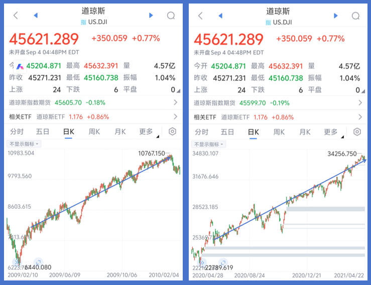 大家可以去看看道琼斯指数的走势:以“斜直线”的方式几乎占据了整个牛市的过程。