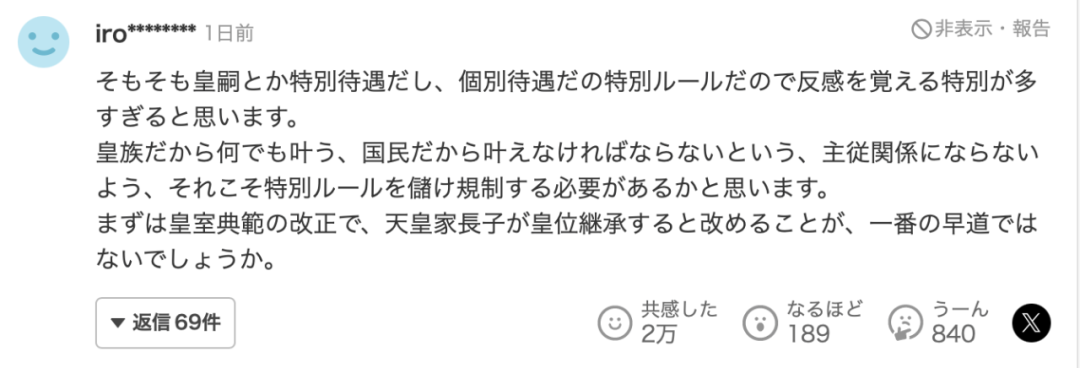 “日本皇族本来就享受各种特别待遇,而且他们能享受的特殊待遇真让人巨反感。因为是皇族,所以想要什么都能实现。因为我们是国民,所以必须让皇族如愿以偿。为了不成为皇族的仆人,我认为需要制定特别的规章制度来管制皇族的花销。特别是要对皇室典范进行修改,直接让天皇家的长子长女继承皇位。”