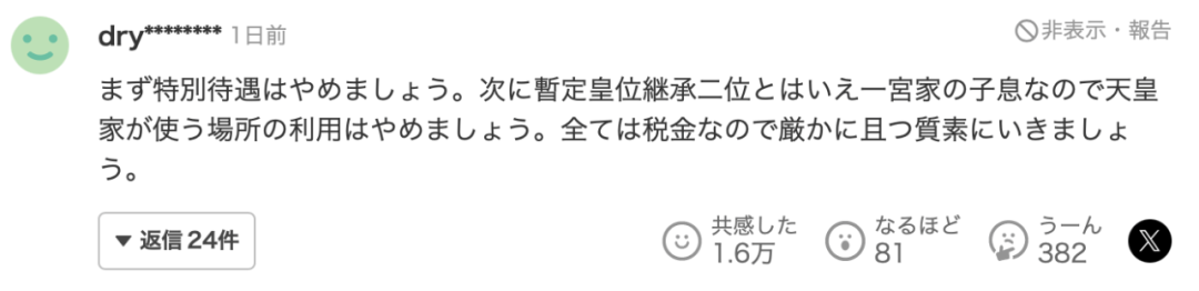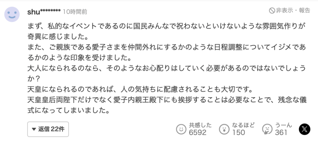 “明明就是私人活动,偏偏要日本全体国民给你耀祖庆生,真是有够奇怪的。另外,将亲人爱子排除在日程之外,让我感到她好像是被欺负了。话说,悠仁都成为成人了,不应该要考虑到这点人情世故吗?要想成为天皇,必须得学会这些礼节啊。毕竟悠仁不仅要向德仁天皇夫妇行礼,也必须向爱子公主行礼,然而如今这却成为了令人遗憾的成人礼。”