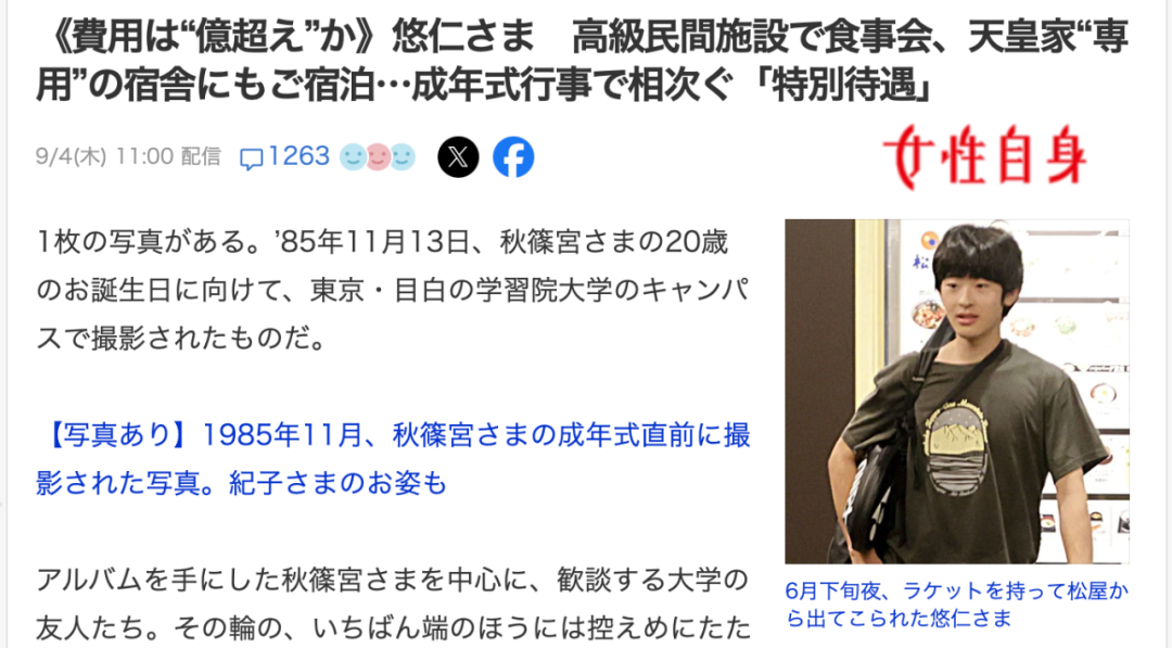 《費用は“億超え”か》悠仁さま 高級民間施設で食事会、天皇家“専用”の宿舎にもご宿泊…成年式行事で相次ぐ「特別待遇」 女性自身
