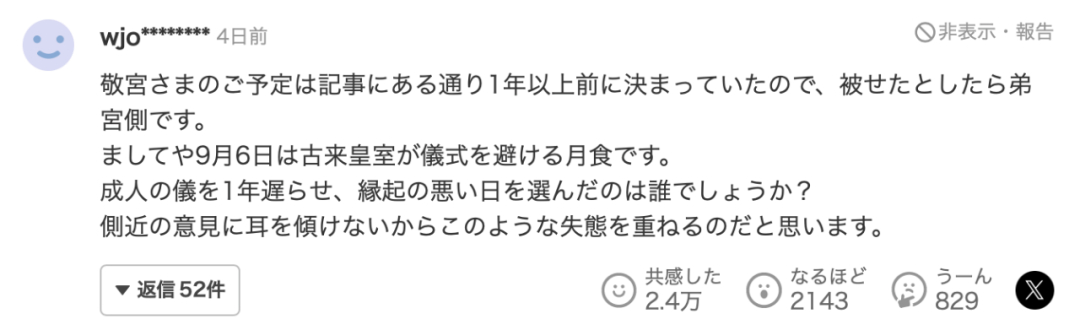也有日本网友指责秋筱宫一家不懂避讳。他们认为,9月6日是一个大凶之日,不适宜铺张浪费、大搞仪式典礼。
