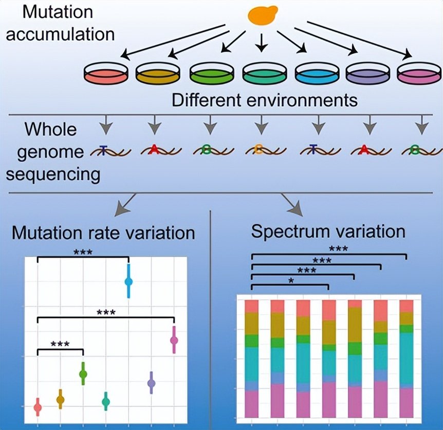 图3. 不同环境下酵母突变率与突变谱的差异(图片来自于Liu and Zhang, 2019)