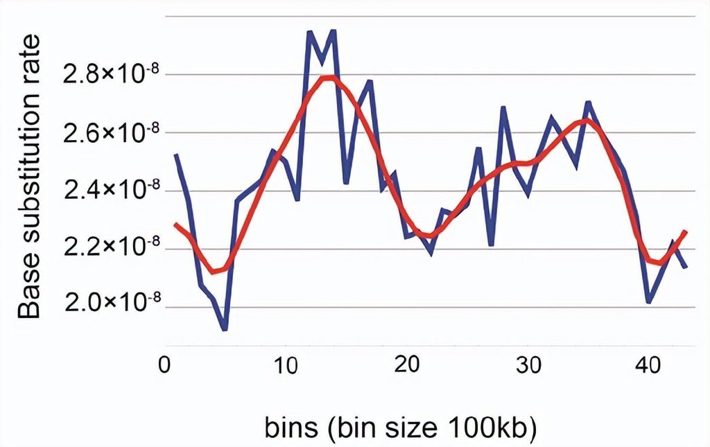 教材中解释突变是随机的,是因为突变可能发生在个体任何不同发育阶段或基因组的不同位置,即基因组位置和发育阶段上的随机性。在统计学中,“随机"意味着我们无法预测一个事件是否会发生,或者它发生的方式没有规律可循。但突变的发生并不是完全随机的,且是可以预测的。例如,在DNA链中,碱基两侧有G:C碱基对,突变率比没有G:C碱基对时高出数倍;在细菌全基因组水平,突变率会在复制起点和复制终点间,形成一个波动的模式 (Wu et al., 2021)(图2);此外,5-甲基胞嘧啶 (5-mC) 脱氨基后会变成胸腺嘧啶(T),因此甲基化程度也会显著影响突变率和突变方向 (Wu et al., 2024)。