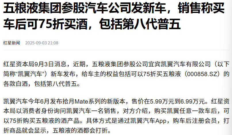 现在倒好,五粮液跑到自家投资的凯翼汽车APP打75折卖了。