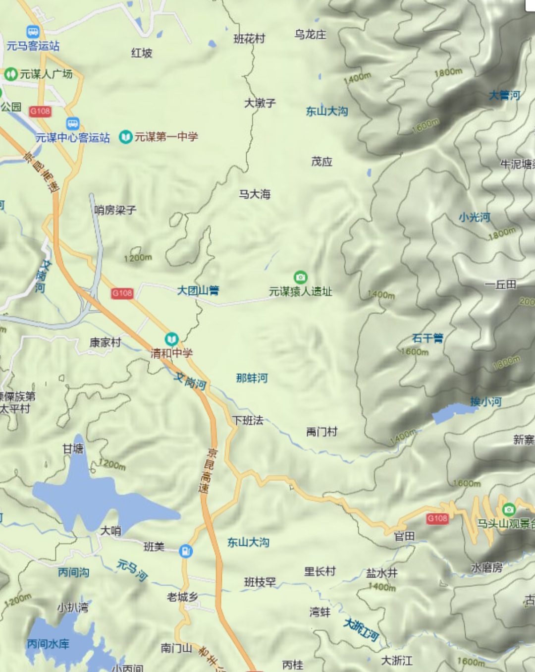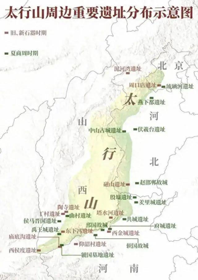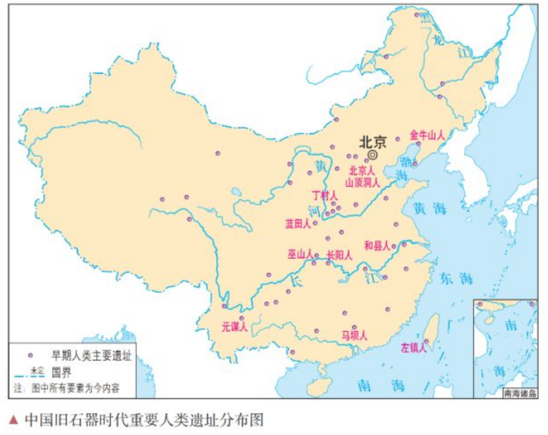 将云南元谋晚期猿人遗址和辽宁金牛山早期智人遗址连成一条线,西侯度遗址、蓝田晚期猿人遗址、北京人遗址都在附近。