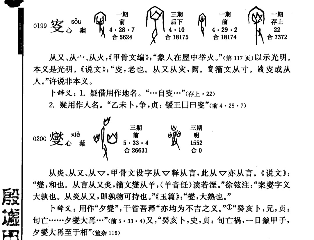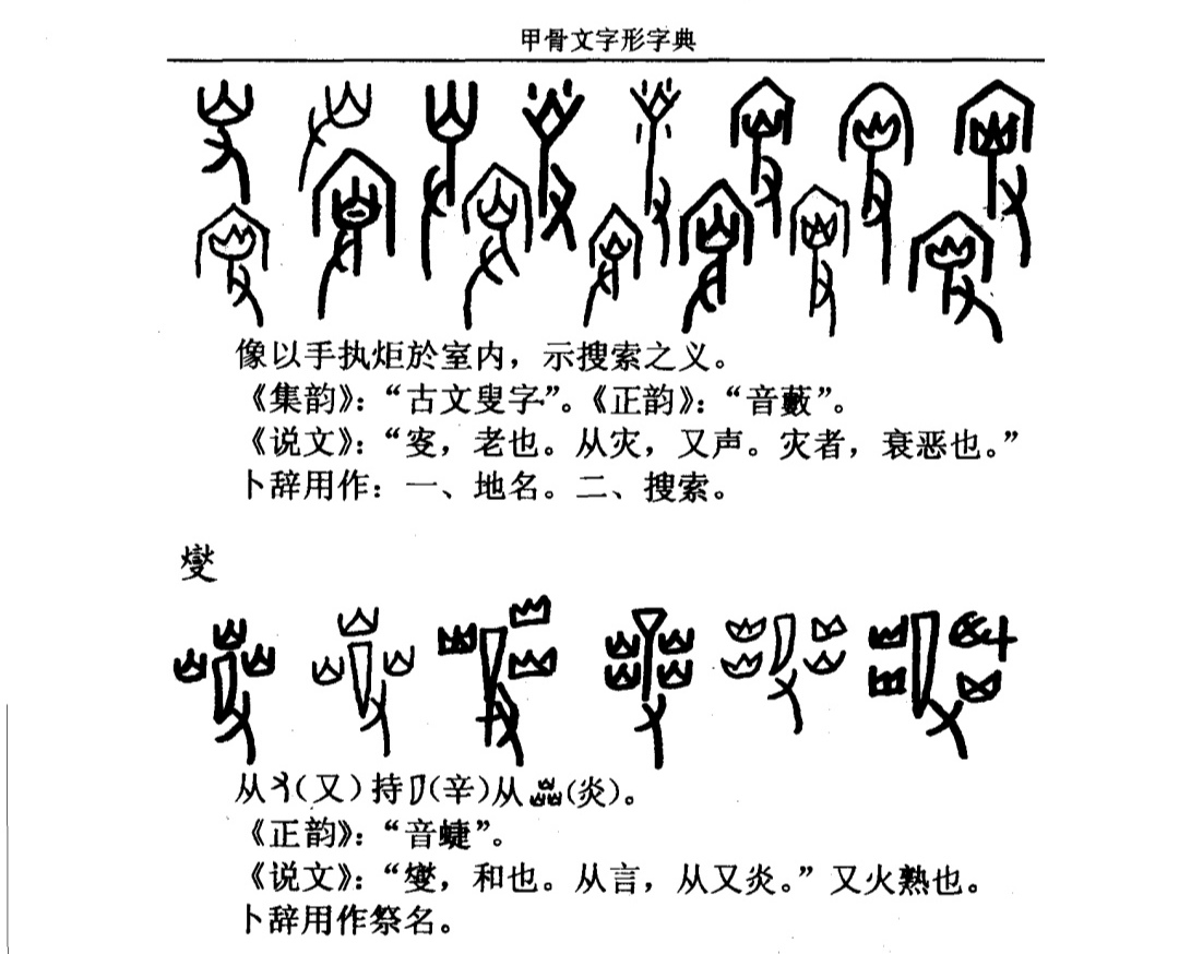 甲骨文【叟(手持柴火)廋(屋内举火把)搜】用作地名、人名或搜索。