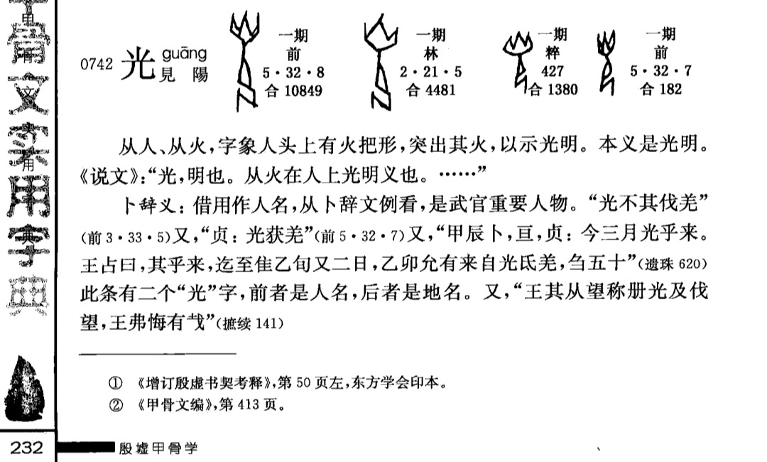 甲骨文【光(正坐人形头部明火会意)】用作人名、地名。