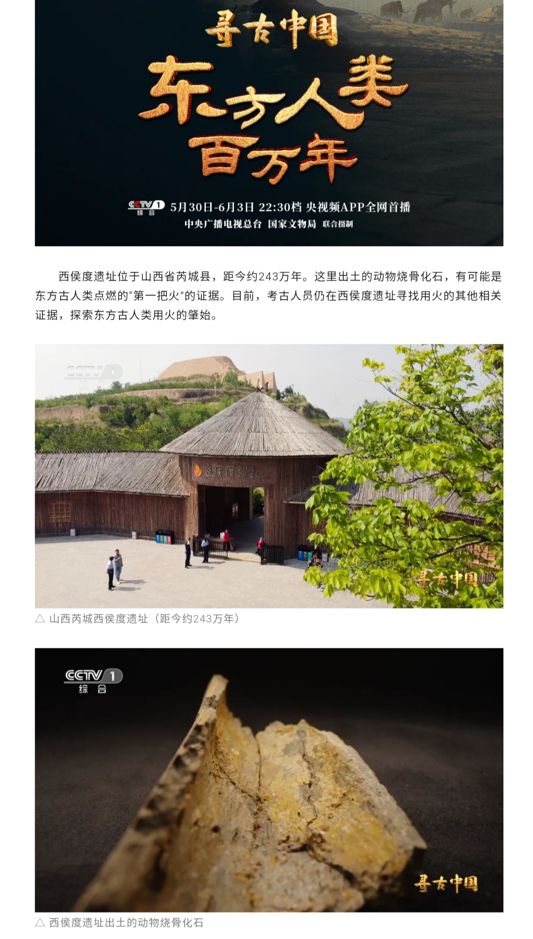 西侯度遗址,位于山西省运城市中条山西南端(现代海拔约563米)。文化层中发现了一些黑灰、灰绿色的化石,大多是哺乳动物的肋骨、鹿角和马牙。研究测定表明,这些不同颜色的化石为烧骨。证实古人类已掌握用火技术。据古地磁断代初步确定、年代为距今243万年,是已知最早的人类用火遗址。