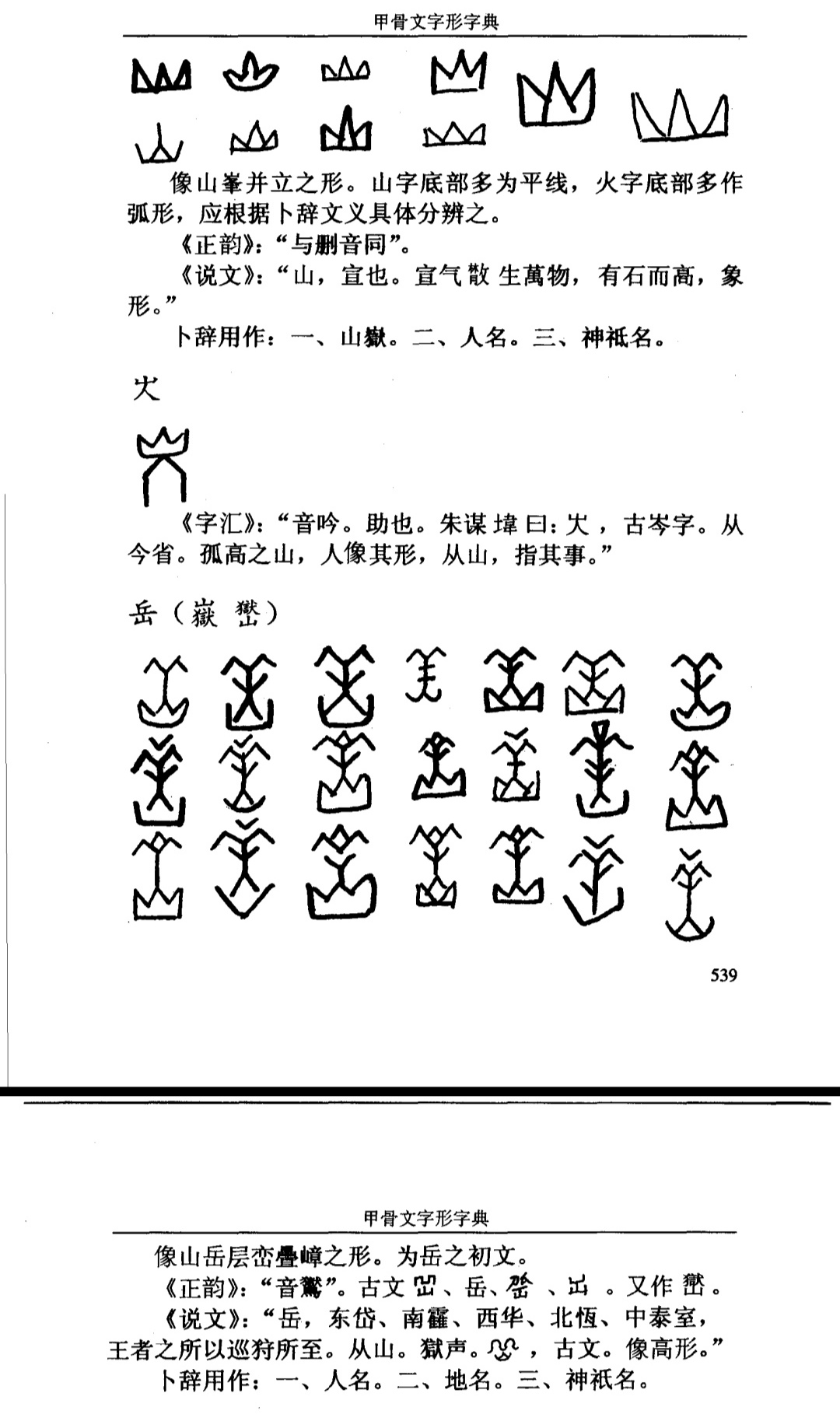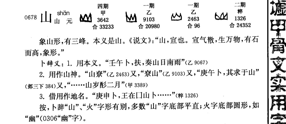 甲骨文【山(平底山峰形)】词例:山尞、尞山。其求于山。奏山日南雨。