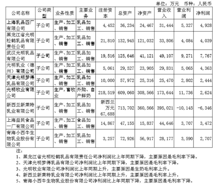 “趣解商业”注意到,毛利下滑的子公司里,就包括光明乳业2021 年并购的青海小西牛生物乳业股份有限公司。