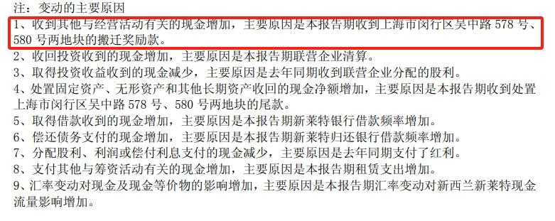 不过,今年上半年光明乳业经营活动产生的现金流量净额4.17亿元,同比大增82.28%;然而,现金流增长核心原因是“收到上海市闵行区吴中路578号、580号两地块的搬迁奖励款”。这是典型的非经常性收益,和乳制品生产销售的主营业务毫无关系。