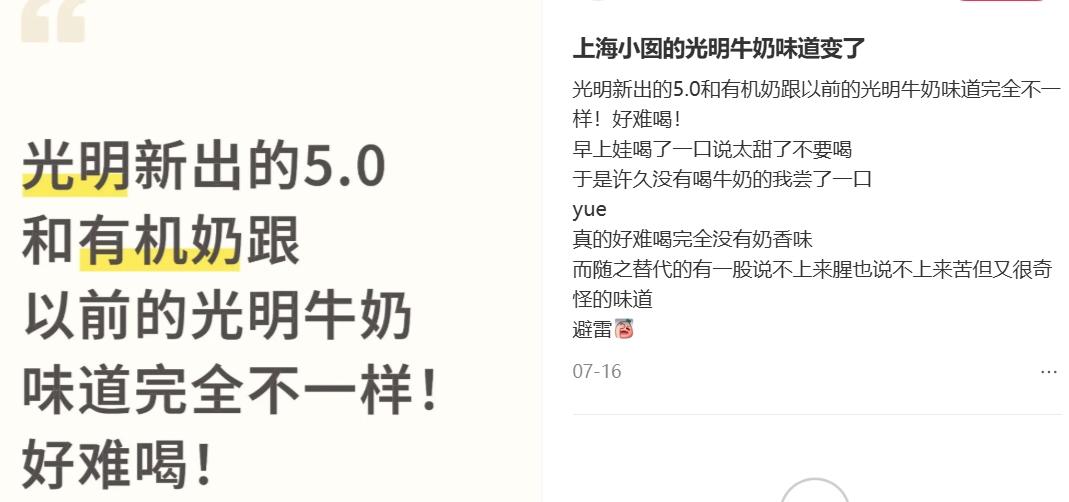 上海是光明乳业的“大本营”,但近期有上海网友表示,如今光明优倍5.0牛奶跟以前的味道有不小差异。