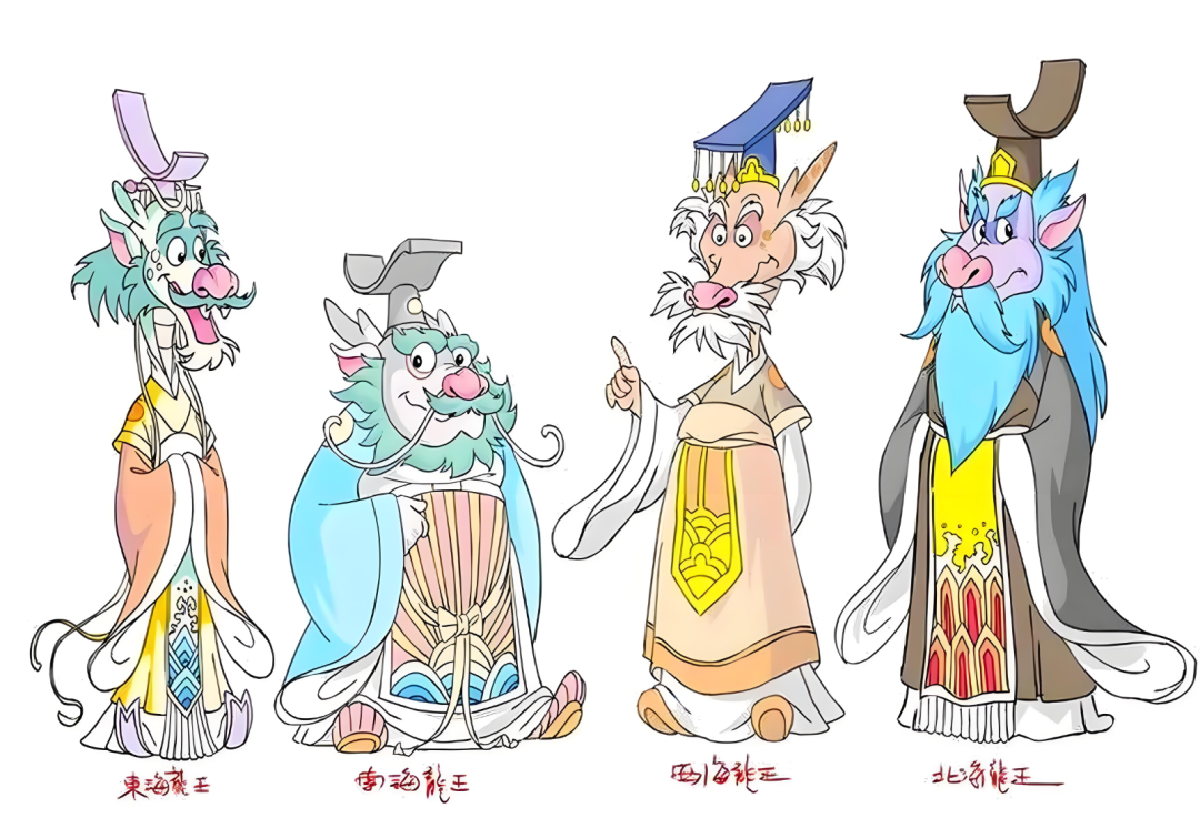 **五是龙王形象的泛化。**在民间故事中,一切水族都有可能被称作龙子和龙女,其中最典型的形象是小蛇、鲤鱼、金鱼,甚至龟、鳖、巨蟹之类。龙王的形象尤其多样化,除了宗教美术中的菩萨形象、帝王将相形象、龙头人身形象、人头蛇身形象,民间文学中最常见的是白胡子老头形象,此外还有黑大汉、黑脸长工、白衣秀才、英俊小伙,以及变身的大鱼、山羊等形象。