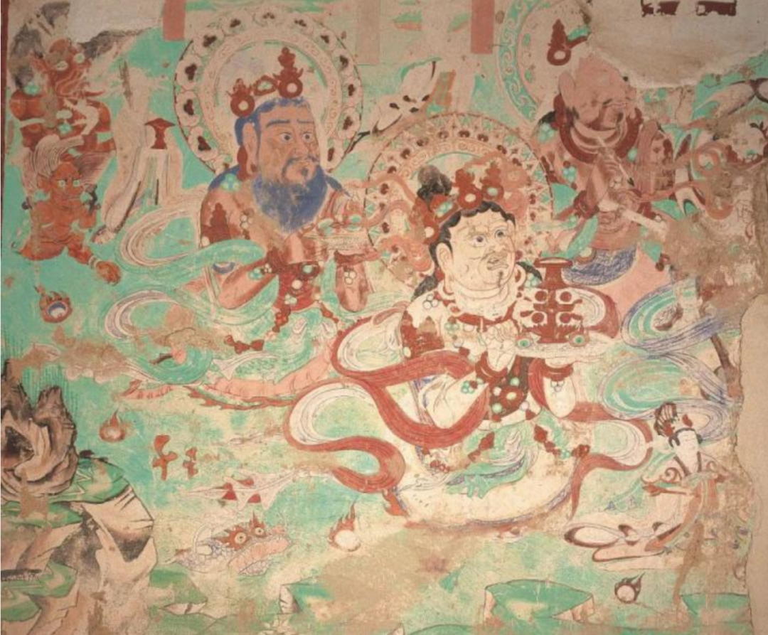 东晋佛教译著《大灌顶经》中的五方龙王,阿修诃、那头化提、诃楼萨叉提、那业提娄、阇罗波提这些名字看起来虽是印度名字,但只要看一看这些龙王的称号——东方青龙神王、南方赤龙神王、西方白龙神王、北方黑龙神王、中央黄龙神王,就知道这已经是掺杂了中国五行观念的“混血龙”。也就是说,**翻译者或者传抄者在将佛经转译成中文的时候,就已经参照中国传统文化观念,将佛经内容中国化了。**汉魏以降,大量的大乘佛经被翻译成中文,伴随着僧侣的口头传讲,佛教的龙王故事在民间得到广泛传播。史载竺法护在长安弘法期间:“四方士庶,闻风响集,宣隆佛化,二十余年。”可见当时就已形成广泛影响。