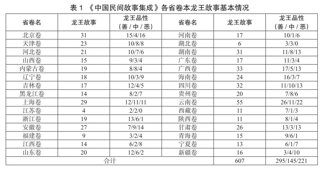 所谓龙王故事,特指拟人化的龙故事,也即故事中的龙无论作为主角还是配角,必须是懂得情感表达,可以进行语言交流,具有社会行为的龙神。本文以《中国民间故事集成》“全国省卷本”19009篇民间故事中检出的607篇龙王故事作为背景材料,基于对龙王社会行为的价值判断,对每篇故事的龙王、龙女、龙子进行了价值归类(见表1)。